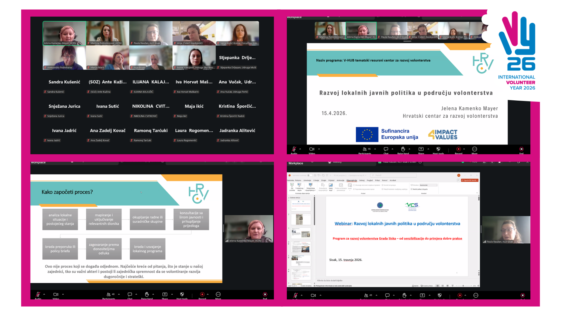U okviru programa V-Hub – Tematski resursni centar za razvoj volonterstva Hrvatski centar za razvoj volonterstva održao je još jedan u nizu tematskih webinara usmjerenih jačanju kapaciteta volonterskih centara i organizatora volontiranja. Webinar pod nazivom „Razvoj lokalnih javnih politika u području volonterstva“, održan 15. travnja 2026., okupio je više od 50 predstavnica i predstavnika volonterskih centara i organizatora volontiranja iz cijele Hrvatske.
